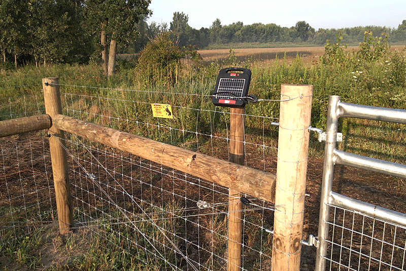 As with most game fencing, this one also included a hot wire that acts as a deterrent-typical for cattle fencing. The cattle wire is an insulated, grounded system separate and set above the rest of the fencing. The electrification is powered by a standard self-contained solar collector and power storage unit that generates 2,000+ volts. The gates can withstand cattle/buffalo impact as will the deep set fence posts.