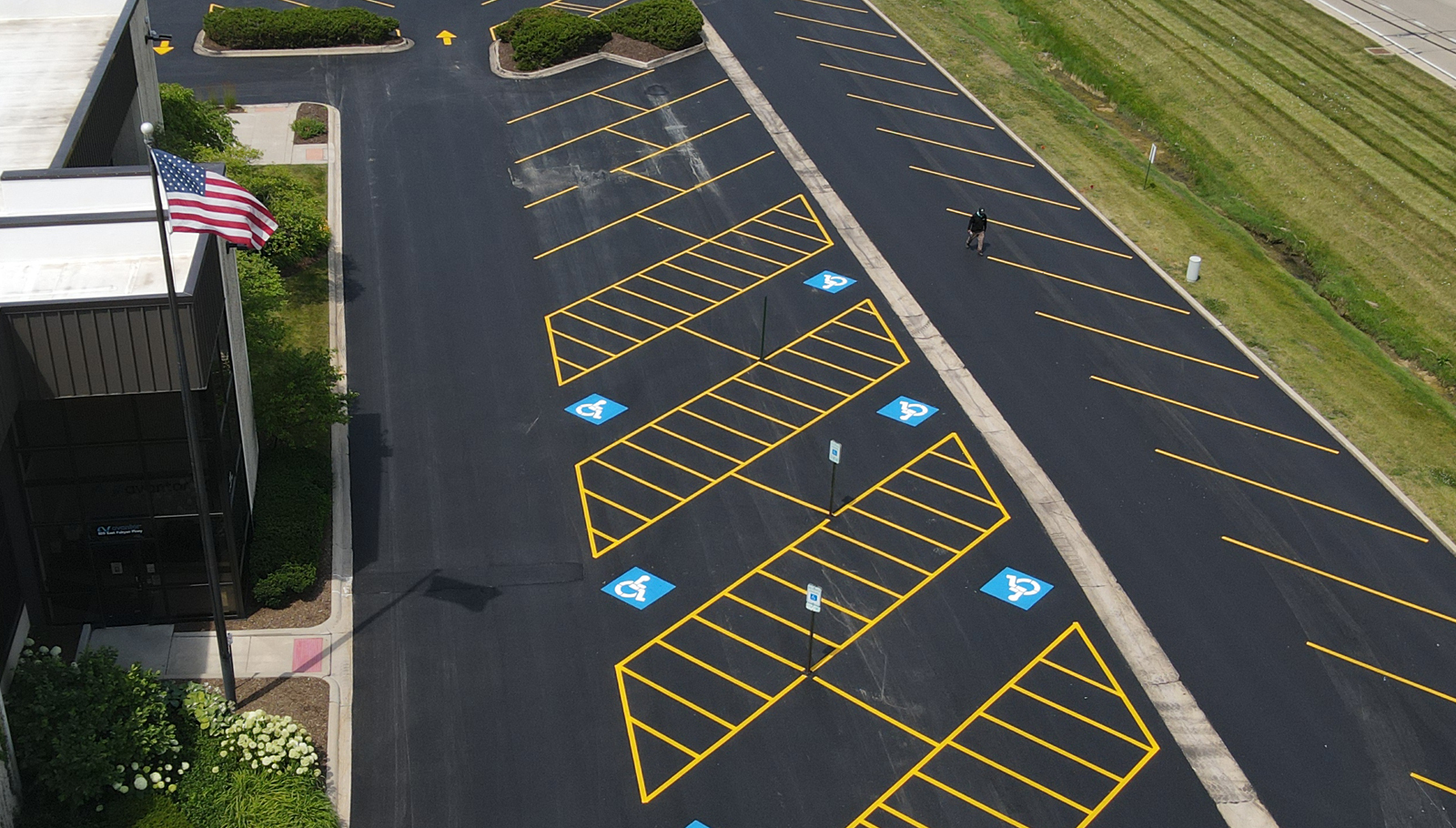 Once you have the perfect sealcoating or paving job complete, you will need your pavement marking. When it comes to parking layouts, there are strategies for efficiently organizing multiple indoor or outdoor parking spaces. Strategies to consider when laying out parking are: the directions of traffic, systems of either one or two way traffic, the angle of the spaces, the type of vehicles being parked and the inclusion of pedestrian walkways and landscape elements. Typically, businesses will have a legacy layout that we can duplicate or modify to improve the flow of your area. When planning your sealcoating or pavement project, let us know and we can offer you options that will meet your needs and exceed your expectations.